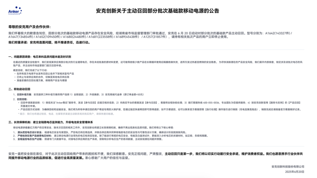 安克创新(300866)在6月20日发布的召回公告中称,公司在质量安全检查中发现某供应商部分批次的行业通用电芯,存在未经批准的原材料变更,这可能导致极少数产品在长期循环使用后隔膜绝缘失效,进而引发过热甚至燃烧的安全隐患。