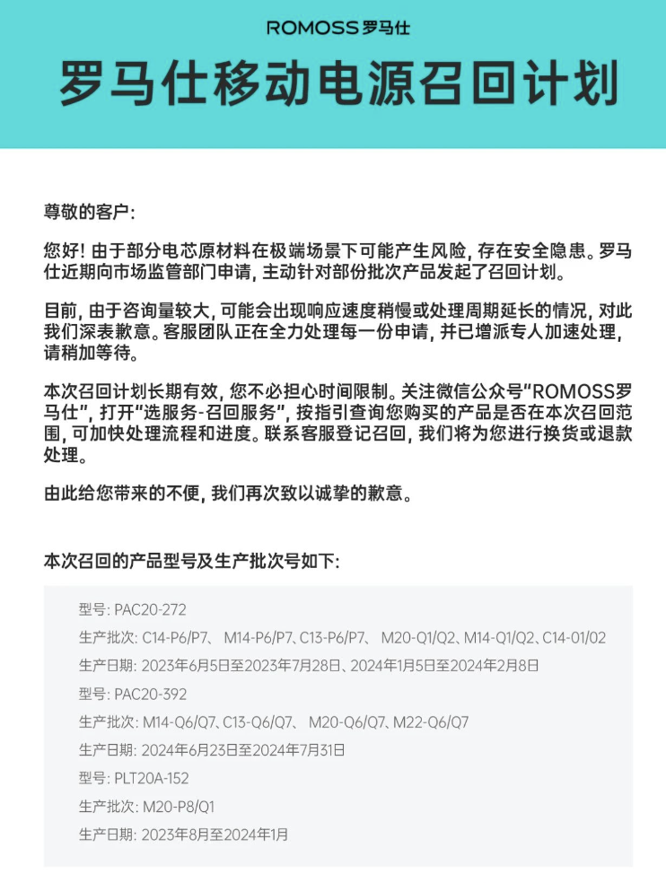 已有部分相关企业启动召回程序。罗马仕在召回计划中写道,“部分电芯原材料在极端场景下可能产生风险,存在安全隐患。”