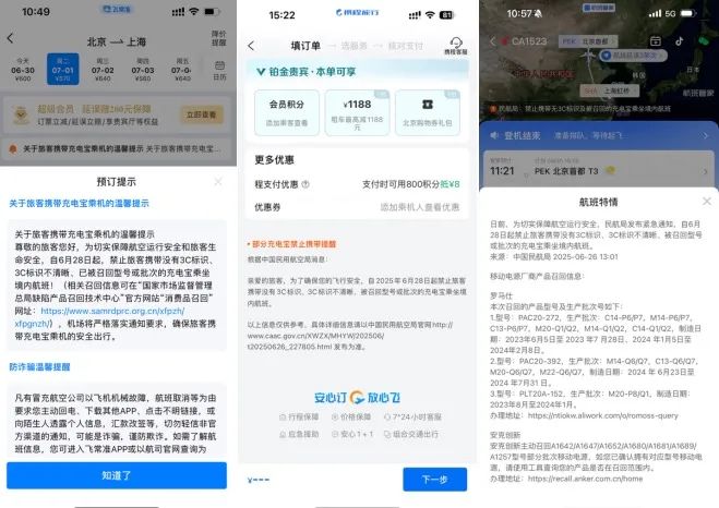 记者在采访中了解到,飞常准、携程、航班管家等平台均已在购票流程的关键节点,如:信息填写页、订单详情页、乘机人信息勾选处,添加了关于携带充电宝新规的明确提示。