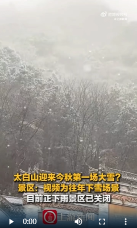 9月18日,网友发帖称,陕西太白山迎来今秋的第一场大雪,并晒出视频画面,山林间白雪纷飞,屋檐上覆盖着薄雪。视频一经发布迅速引发网友热议,不少网友留言表示“真的下雪了吗”“真的的话我们马上出发”,也有网友直言“假”,更有人表示“周末正准备去”。